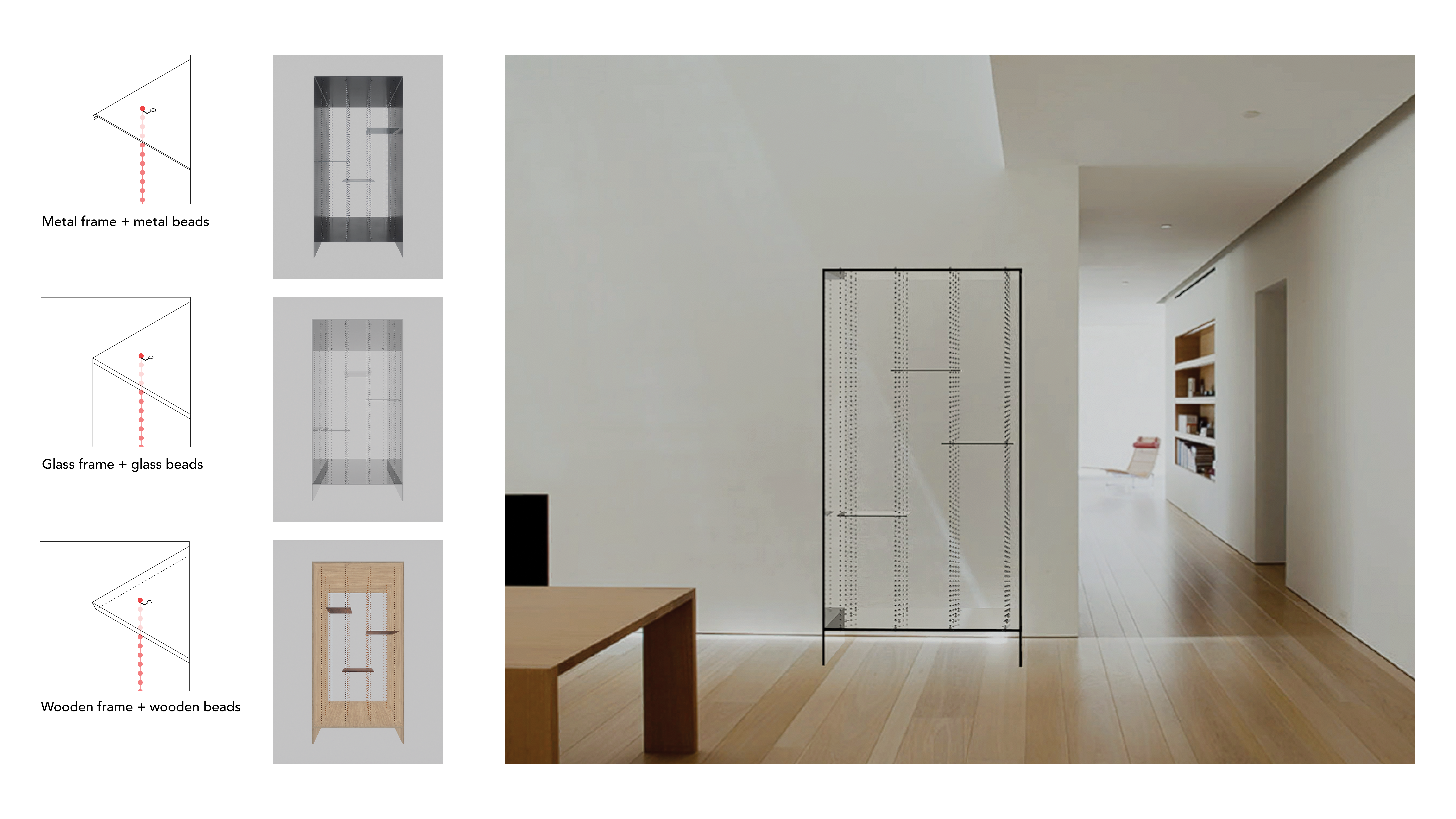 Inspired by the evocative project "Hiraeth," this piece embodies a profound exploration of memories and dreams within a domestic context. "Hiraeth" delves into nostalgia's depths, blurring reality and the surreal, challenging our grasp of the tangible and the subconscious. The self-standing display shelf, crafted from transparent glass, exudes an ethereal lightness, with delicate beads cascading like fragmented memories. These beads serve as metaphors, shaping domestic spaces and weaving together the threads of recollection. Extending the layering concept, the evenly spaced beads offer versatility, allowing users to adjust dividers as they see fit. This flexibility metaphorically represents memories as fluid, adaptable, and ever-evolving. This furniture piece is an exploration of the relationship between domestic spaces and memories, illustrating how the past continually shapes and reshapes our perception of the beloved spaces. It serves as a poignant reminder of the power of memory and the nostalgic yearning encapsulated in the word "Hiraeth."